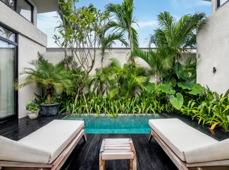 The bedroom is located opposite of the living area. It is generously sized and offers a peaceful retreat, featuring a comfortable bed, a wardrobe, and an en-suite bathroom. One of the highlights of Uluwatu Villa Blue Kai is its private swimming pool. The pool offers a refreshing oasis where you can relax and chill. It’s also the perfect spot for enjoying a cup of coffee in the morning or a quick meditation before starting your day.